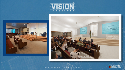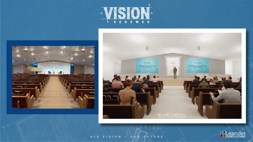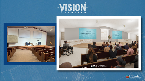 We’re excited to announce that construction begins July 7 on a full renovation of our main auditorium as we kickoff phase one of our Vision Renewed campaign at Leander Church of Christ! This project marks a bold and beautiful step forward in creating a space that reflects the heart of our worship and the exciting growth of our church family. When completed, our updated auditorium will be both reverent and refreshed, honoring the tradition of our heritage while welcoming in new light, sound, and accessibility.